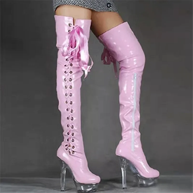 Nuovi stivali sopra il ginocchio di alta qualità Ragazze Lace Up Stivali da donna di moda 15 cm Tacchi a spillo Vendita calda Scarpe da donna dal 35al46