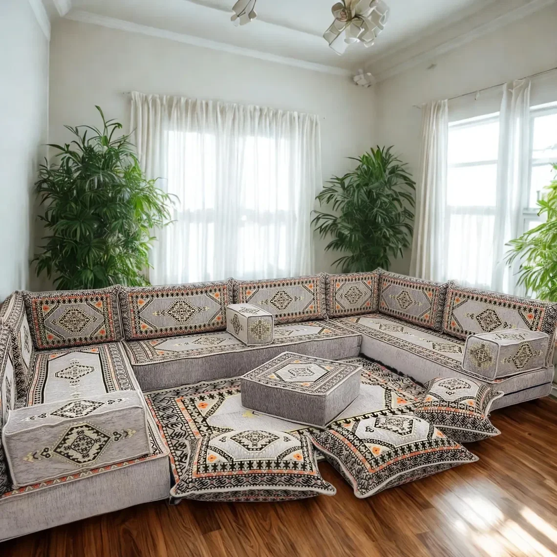 Trasforma il tuo spazio abitativo con questo lussuoso set di divani in stile arabo: un vero e proprio elemento d'arredo, progettato per coniugare fascino estetico e comfort pratico. Con i suoi cuscini di base spessi 20 cm e le fodere lavabili, questo divano modulare a U Majlis offre il perfetto connubio tra tradizione e praticità.